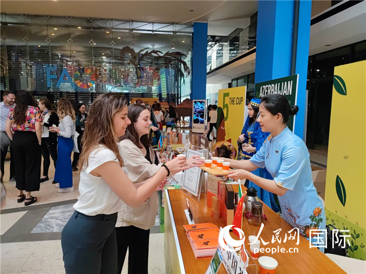 與會(huì)嘉賓在中國(guó)展臺(tái)品茶。人民網(wǎng)記者 謝亞宏攝