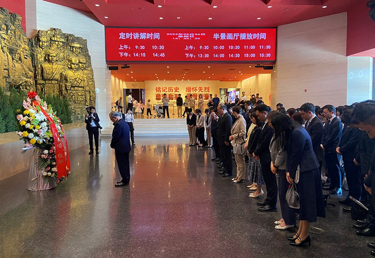 創(chuàng)價學(xué)會會長原田稔及青年代表團向中國人民抗日戰(zhàn)爭紀(jì)念館敬獻花籃。中國人民抗日戰(zhàn)爭紀(jì)念館供圖