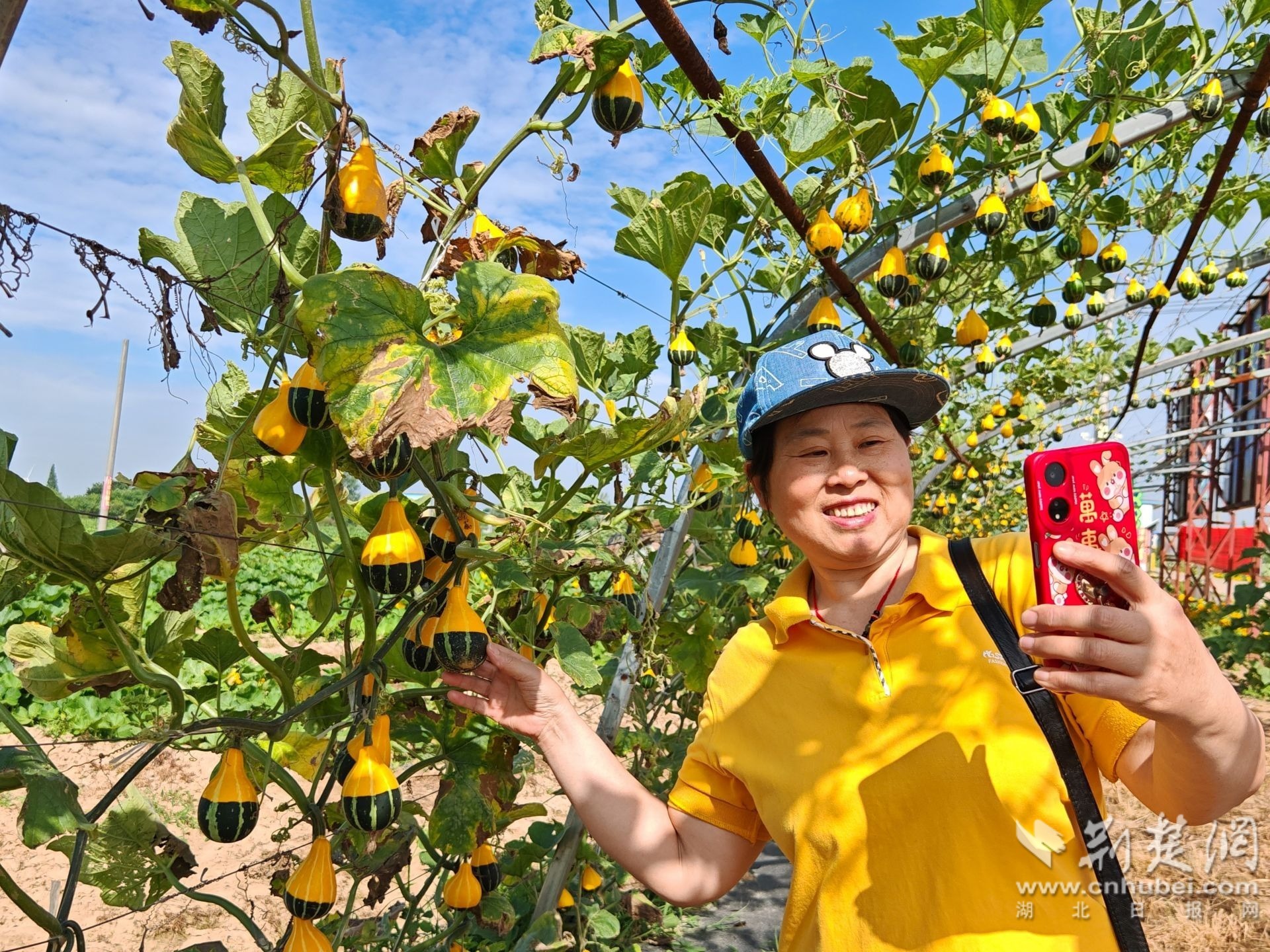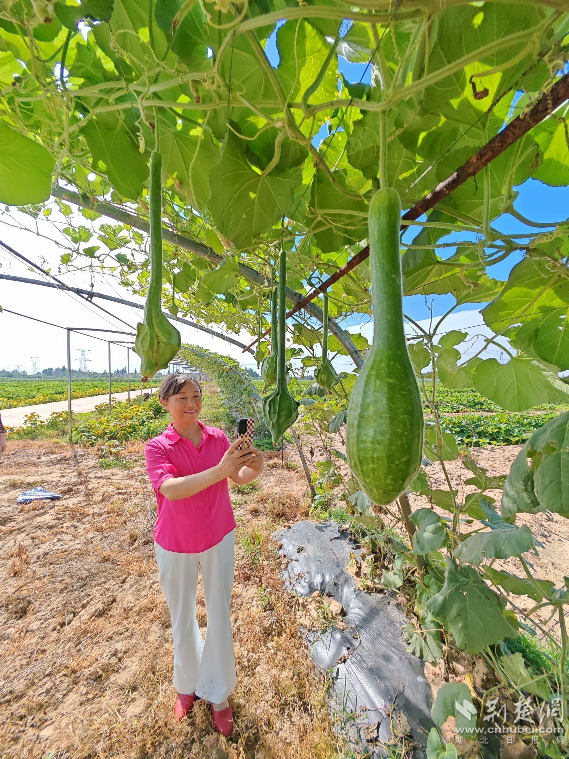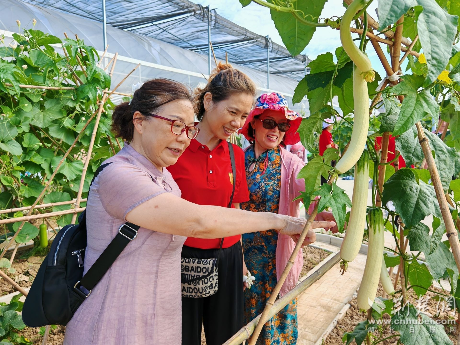 這些遠(yuǎn)道而來的客人,首先到四季長(zhǎng)青蔬菜種植專業(yè)合作社便民服務(wù)站觀看擺放的各種葫蘆、南瓜,到科普基地觀看奇果異瓜,到幼苗工廠觀看無土栽培,到田頭觀看連體架上生長(zhǎng)的“鴛鴦梨”“鶴首”“迷你葫蘆”,又到“每之文農(nóng)場(chǎng)”的荷花池邊觀賞荷花,有的還登上拖拉機(jī)駕駛室體驗(yàn)農(nóng)耕生活,還有的則到菜地采摘新鮮的茄子、莧菜、黃瓜等蔬菜。大家在稀奇古怪的葫蘆地、綠油油的菜地、整齊的甘蔗苗地以及漂亮的荷花池邊觀賞拍照,流連忘返。