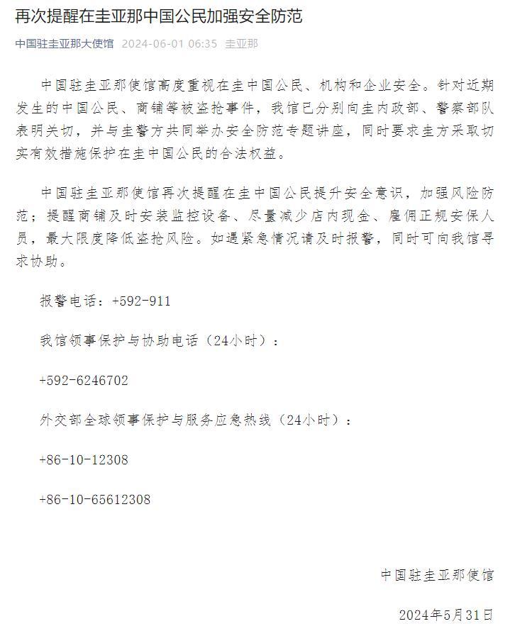 中國駐圭亞那使館再次提醒在圭中國公民提升安全意識,加強風(fēng)險防范;提醒商鋪及時安裝監(jiān)控設(shè)備、盡量減少店內(nèi)現(xiàn)金、雇傭正規(guī)安保人員,最大限度降低盜搶風(fēng)險。如遇緊急情況請及時報警,同時可向我館尋求協(xié)助。