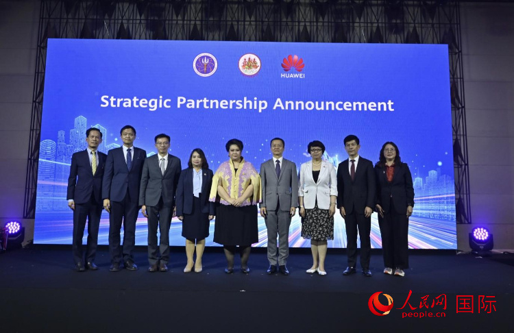 數(shù)字人才峰會現(xiàn)場。左五為泰國高等教育、科學(xué)、研究和創(chuàng)新部長素巴瑪·伊沙拉帕迪,右三中國駐泰國大使館教育參贊許蘭,右四為華為泰國技術(shù)有限公司總經(jīng)理李雄偉。人民網(wǎng)記者 簡承淵攝