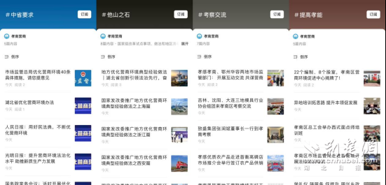 “孝納百川”欄目有4個(gè)專區(qū),分別為:“中省要求”,主要展示營(yíng)商環(huán)境條例和國(guó)家、省、市發(fā)布的營(yíng)商環(huán)境指導(dǎo)意見(jiàn)、工作方案等文件;“他山之石”,主要展示國(guó)家級(jí)改革試點(diǎn)事項(xiàng)、做法,國(guó)內(nèi)各地營(yíng)商環(huán)境特色亮點(diǎn)工作以及營(yíng)商世界等微信公眾號(hào)發(fā)布的最新訊息等;“考察交流”,主要展示各地各部門(mén)外出考察和外地赴孝南考察交流的有關(guān)動(dòng)態(tài);“提高孝能”,主要展示全區(qū)營(yíng)商環(huán)境培訓(xùn)工作。