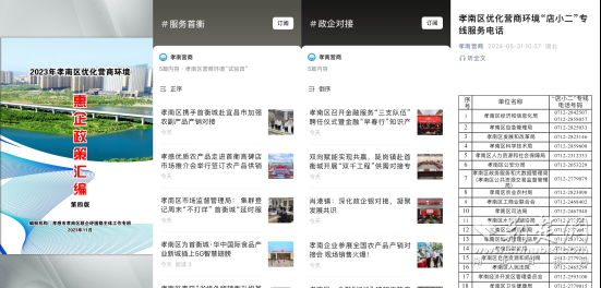 最后一個(gè)欄目“孝親熱線”有4個(gè)專區(qū),分別為:“部門(mén)熱線”,主要展示區(qū)直各部門(mén)“店小二”熱線電話和營(yíng)商環(huán)境投訴舉報(bào)電話等;“政企對(duì)接”,主要展示區(qū)內(nèi)“政銀企對(duì)接”“政企早餐會(huì)、午茶會(huì)”“一點(diǎn)三員”“聯(lián)企舒困”等活動(dòng)開(kāi)展情況;“服務(wù)首衡”,主要展示“頭號(hào)工程”和“一號(hào)工程”的“雙向奔赴”,即各地各部門(mén)服務(wù)首衡城工作情況;“惠企政策”,主要展示的是孝南區(qū)的各項(xiàng)惠企惠民政策。