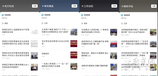 “孝新快遞”欄目有4個(gè)專區(qū),分別為:“先行先試”,主要展示各區(qū)直部門(mén)先行區(qū)創(chuàng)建工作進(jìn)展情況;“孝優(yōu)精品”,主要展示各區(qū)直部門(mén)近年來(lái)特色亮點(diǎn)、典型改革案例;“工作動(dòng)態(tài)”,主要展示各地各部門(mén)落實(shí)“一方案三清單”、典型經(jīng)驗(yàn)復(fù)制推廣等重點(diǎn)工作任務(wù)完成情況;“媒體評(píng)說(shuō)”,主要展示近年來(lái)孝南區(qū)營(yíng)商環(huán)境網(wǎng)評(píng)大賽的優(yōu)秀作品。