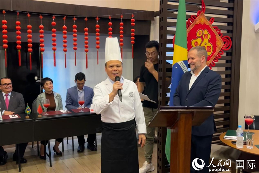 當?shù)貢r間6月4日,巴西里約熱內(nèi)盧州卡西亞斯公爵城舉辦廣式茶點品鑒活動,廣州市南沙區(qū)花園酒店主廚馬圖佳先生制作的南瓜餅、番薯芝士球、紫薯番石榴等近20種廣式茶點,贏得在場嘉賓的濃厚興趣和普遍贊譽。圖為馬圖佳向來賓們介紹廣式茶點的發(fā)展歷史和文化知識。 人民網(wǎng)記者 陳一鳴攝