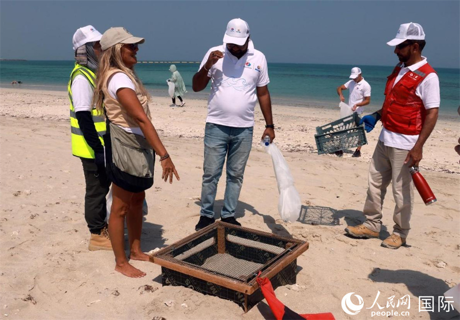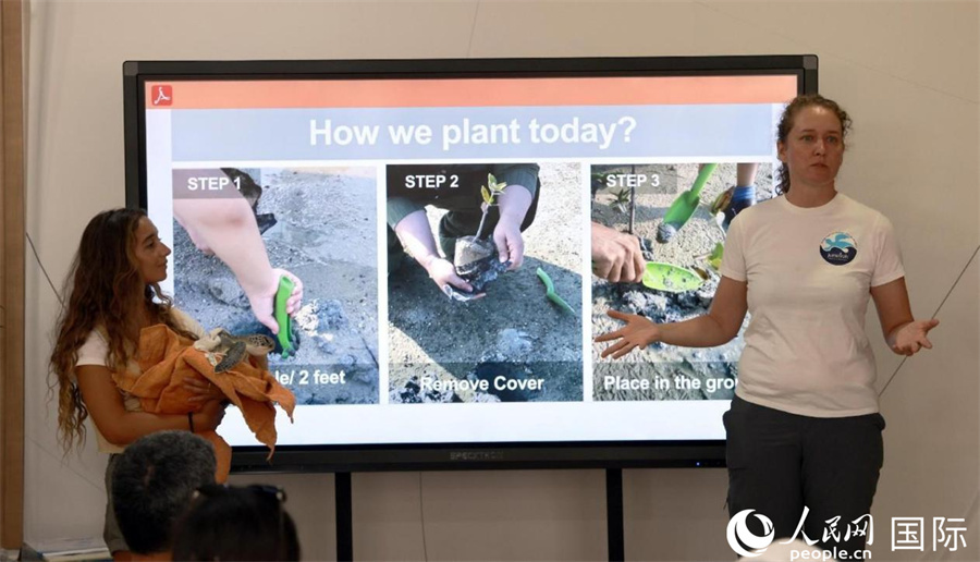 阿聯(lián)酋海洋環(huán)境集團(tuán)專家(左二)介紹海龜產(chǎn)卵保護(hù)方案。人民網(wǎng)記者 管克江攝