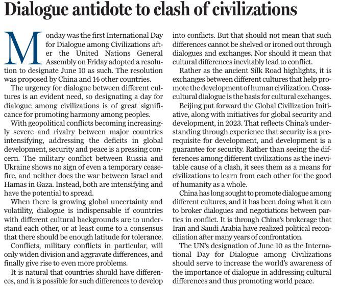 第七十八屆聯(lián)合國(guó)大會(huì)日前協(xié)商一致通過(guò)中國(guó)提出的設(shè)立文明對(duì)話國(guó)際日決議,將6月10日定為文明對(duì)話國(guó)際日。