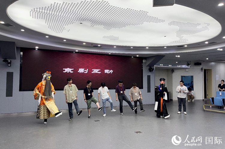 日本大學(xué)生代表團(tuán)學(xué)習(xí)京劇臺(tái)步。人民網(wǎng)記者 陳思攝
