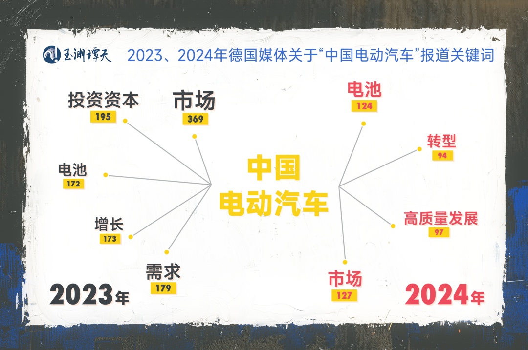 多數(shù)報(bào)道的目光,還是聚焦在自身產(chǎn)業(yè)的發(fā)展上。就拿其中報(bào)道量最高的德國(guó)媒體來(lái)說(shuō)。2023年,德國(guó)媒體報(bào)道的高頻話題是“電池”“增長(zhǎng)”“投資資本”。到了2024年,“電池”“轉(zhuǎn)型”“高質(zhì)量發(fā)展”等話題持續(xù)出現(xiàn)。