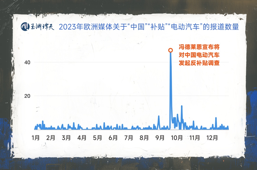利用大數(shù)據(jù)手段,譚主分析了2023年以來(lái)歐盟27國(guó)媒體有關(guān)“中國(guó)電動(dòng)汽車”的報(bào)道。歐委會(huì)宣布對(duì)華電動(dòng)汽車發(fā)起反補(bǔ)貼調(diào)查當(dāng)天,有一個(gè)明顯的報(bào)道高峰。
