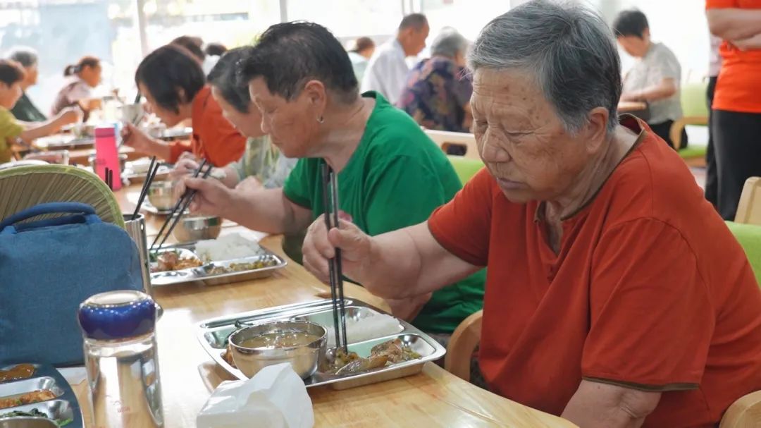 前來就餐的老人們有序排隊(duì)取餐,大家圍成幾桌,一邊吃著美味可口的午餐,一邊聊著家常,臉上洋溢著幸福的笑容。