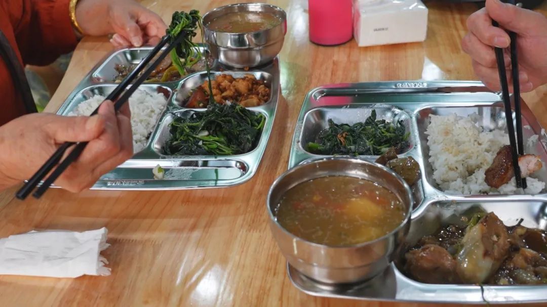 臨近飯點(diǎn),“幸福食堂”里的飯菜香氣撲鼻而來,花園紅燒肉、肉沫豆腐、油淋茄子、炒青菜、蘑菇湯……