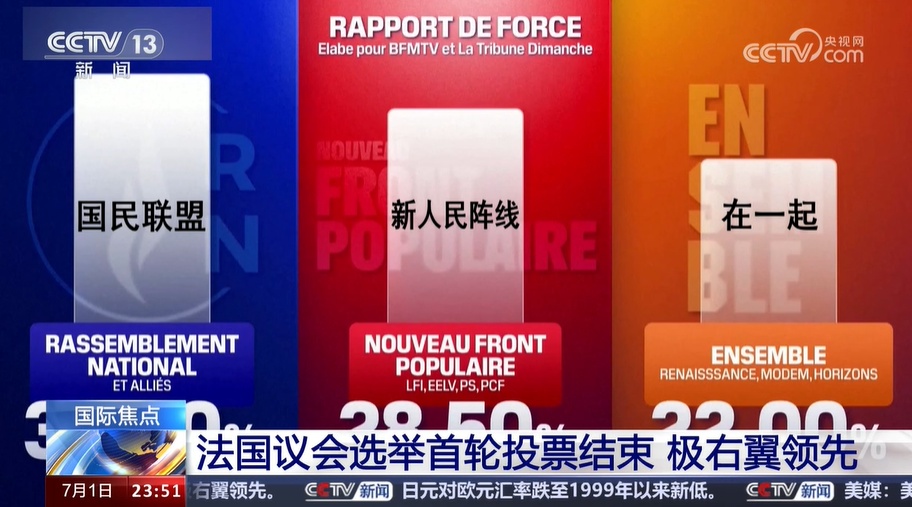 央視網(wǎng)消息:當(dāng)?shù)貢r間6月30日晚,法國新一屆國民議會選舉首輪投票結(jié)束。當(dāng)晚公布的出口民調(diào)顯示,極右翼政黨“國民聯(lián)盟”的得票率領(lǐng)先。