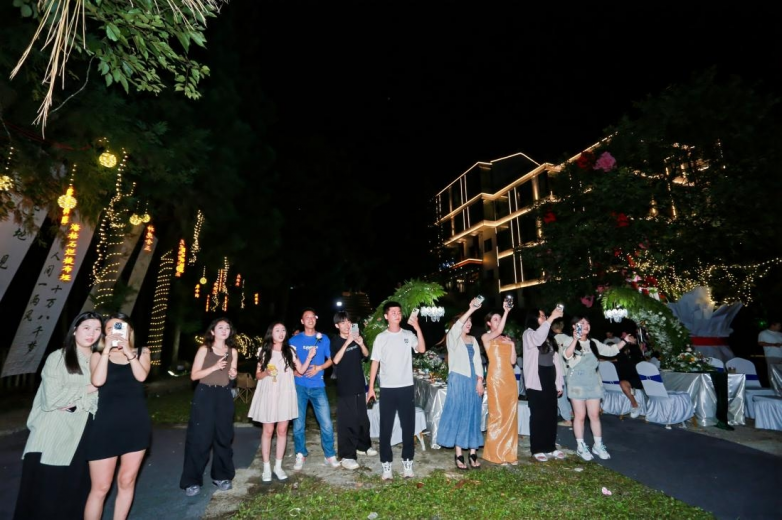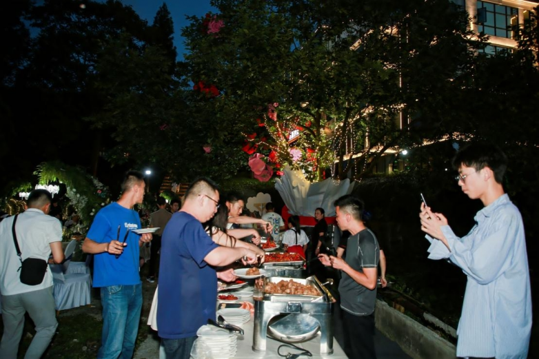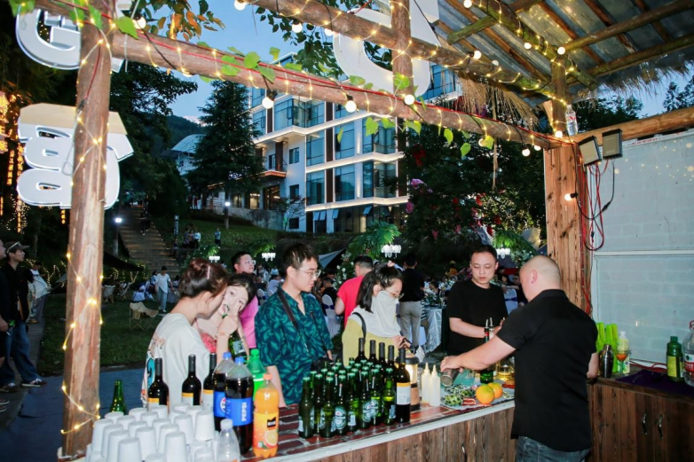石如歌,林如曲,暮色四合,山野撩人。下午19時(shí),石海別院音樂酒會(huì)在一首《光輝歲月 》中拉開帷幕,為嘉賓帶來了一場(chǎng)精彩的視聽盛宴?,F(xiàn)場(chǎng)嘉賓與樂隊(duì)歌手積極互動(dòng),盡情享受美食啤酒小龍蝦,感受了別樣的音樂石林。