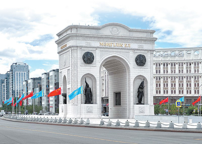 哈薩克斯坦首都阿斯塔納凱旋門旁,中哈兩國國旗迎風(fēng)飄揚。本報記者 張朋輝攝