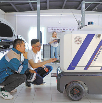 在哈薩克斯坦魯班工坊新能源汽車實訓(xùn)區(qū),兩名技術(shù)員正在操作調(diào)試智能機器人車。本報記者 趙益普攝