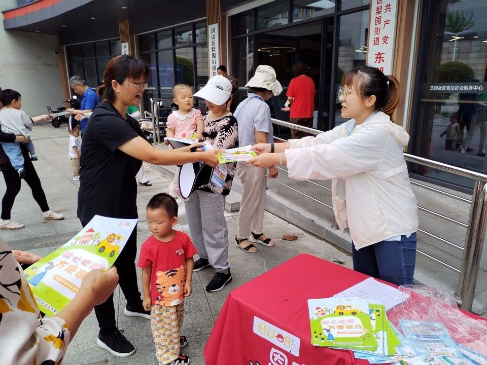 在東湖社區(qū)黨員群眾服務(wù)中心,工作人員通過設(shè)置展板、發(fā)放宣傳單和宣傳品的方式,熱情向來往居民宣傳托育服務(wù)相關(guān)政策、嬰幼兒養(yǎng)育照護(hù)知識(shí)、健康生活理念等,進(jìn)一步加強(qiáng)居民的托育意識(shí)。