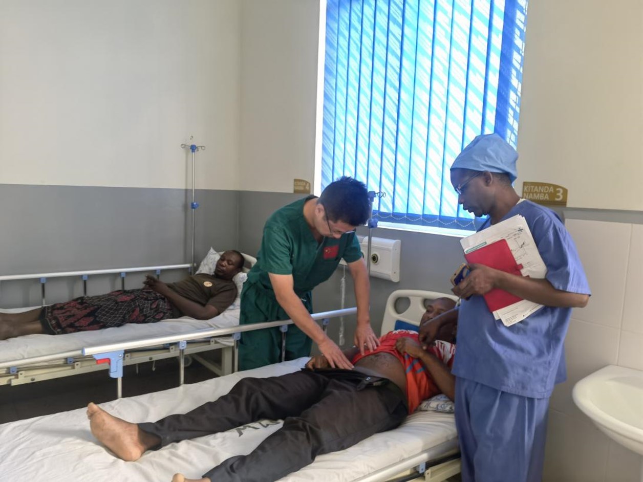 隊長蔣國慶進行術前查房。中國援桑醫(yī)療隊供圖