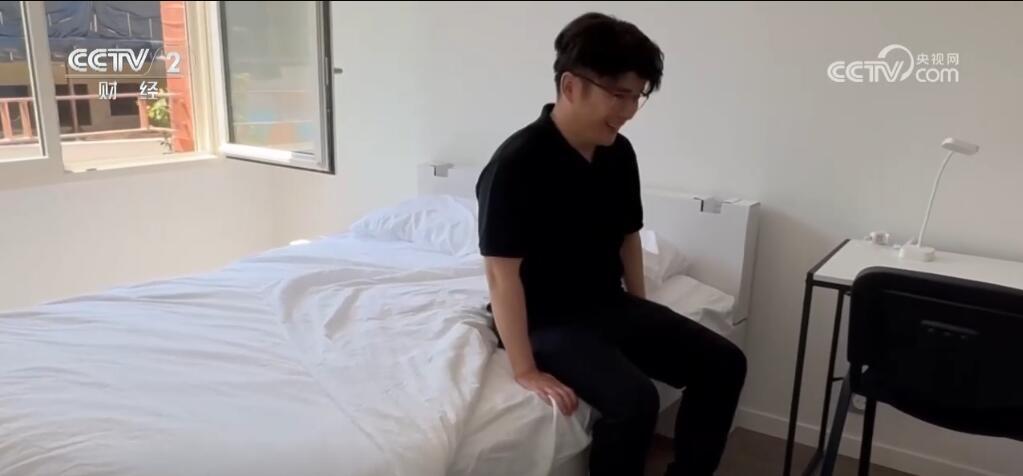 記者來到了巴黎奧運會的媒體村,現(xiàn)在一起到村里去看看。這是媒體村的整個架構(gòu),一起到宿舍樓里去看一看。這是一個箱子,還配了個小冰箱,生活還是很方便的。這是奧運村同款的紙板床,體驗一下,坐上還是感覺非常牢靠的。