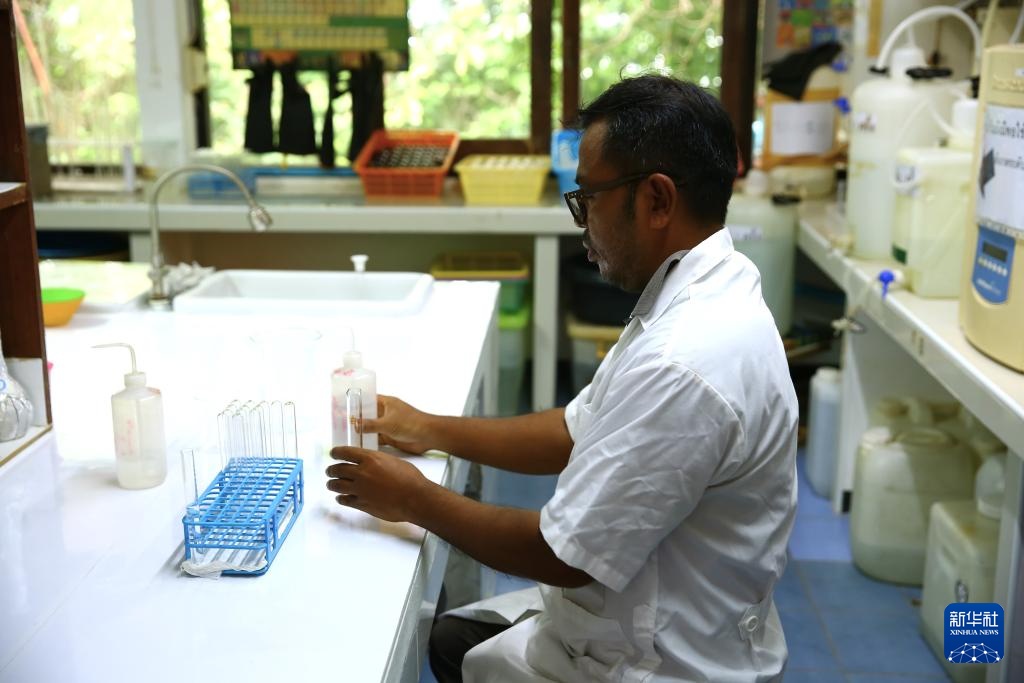 7月23日,在位于泰國普吉的中泰氣候與海洋生態(tài)系統(tǒng)聯(lián)合實驗室,工作人員進(jìn)行水質(zhì)檢測。新華社記者 孫瑋彤 攝