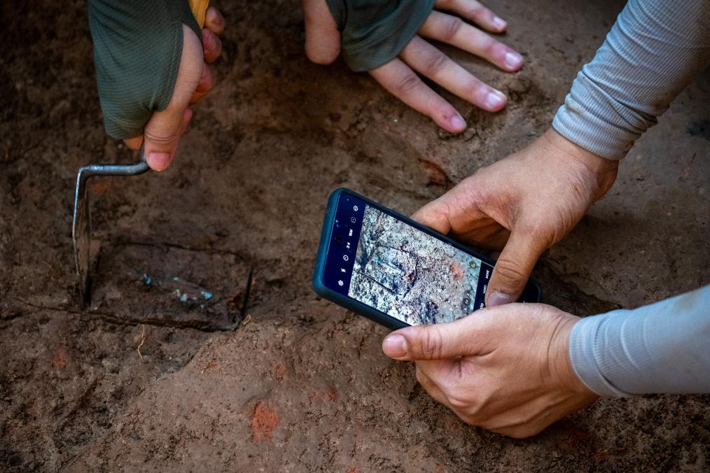 “好像是銅!”——臨近傍晚時(shí)分,考古工地上突然沸騰起來(lái)。耶魯-新加坡國(guó)立大學(xué)學(xué)院學(xué)生李拔漢發(fā)出驚嘆,求教武漢大學(xué)歷史學(xué)院的助教老師進(jìn)一步確認(rèn)自己的新發(fā)現(xiàn)??脊艑W(xué)員輕輕撥開(kāi)細(xì)軟的泥土,竟然是一枚清晰可辨的銅箭鏃。經(jīng)過(guò)拍照記錄,隨后這件新發(fā)現(xiàn)被整體揭取下來(lái),拿回文物陳列室待做進(jìn)一步保護(hù)與分析。