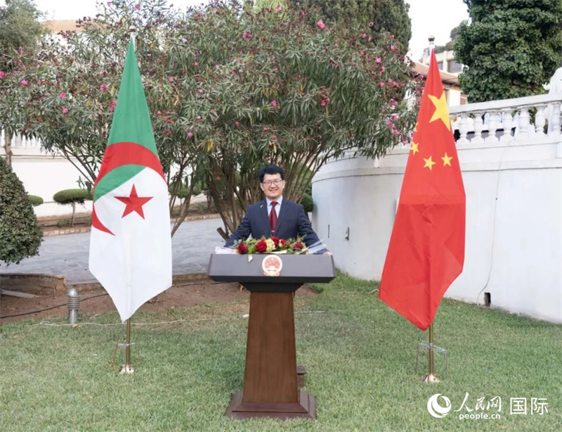 中國駐阿爾及利亞大使李健在招待會上致辭。人民網(wǎng)記者 郝瑞敏攝
