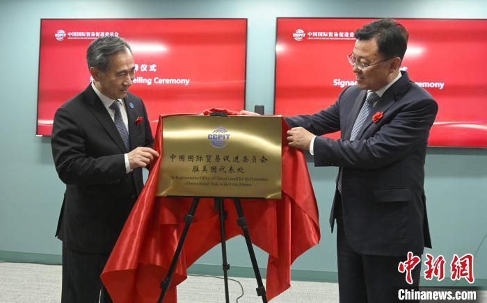 當(dāng)?shù)貢r(shí)間7月30日,中國(guó)貿(mào)促會(huì)駐美國(guó)代表處新址啟用儀式在美國(guó)首都華盛頓舉行。圖為中國(guó)貿(mào)促會(huì)會(huì)長(zhǎng)任鴻斌(左)與中國(guó)駐美大使謝鋒(右)為代表處揭牌。中新社記者 陳孟統(tǒng) 攝