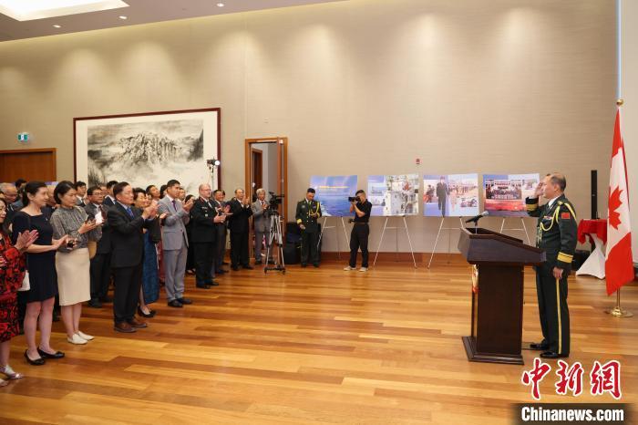 當(dāng)?shù)貢r間7月30日,在中國駐加使館舉行的慶祝中國人民解放軍建軍97周年招待會上,與會人士觀看《守護(hù)和平 命運與共——維護(hù)世界和平的中國軍隊》圖片展?!≈行律缬浾?余瑞冬 攝