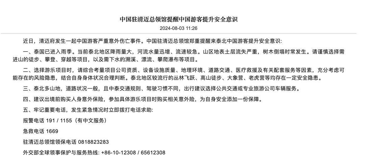 2024年8月3日,中國(guó)駐清邁總領(lǐng)館發(fā)文《中國(guó)駐清邁總領(lǐng)館提醒中國(guó)游客提升安全意識(shí)》。