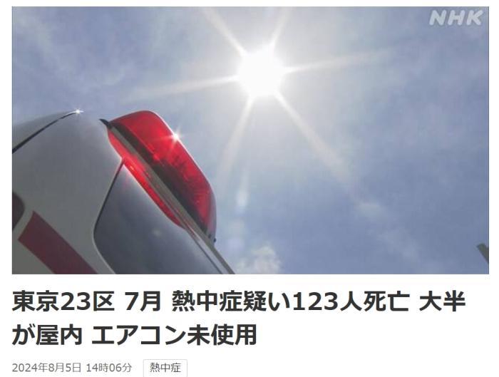 中新網(wǎng)8月5日電 據(jù)日本廣播協(xié)會(huì)(NHK)8月5日?qǐng)?bào)道,根據(jù)日本東京都監(jiān)察醫(yī)務(wù)院的最新統(tǒng)計(jì),東京都23區(qū)7月總共有123人因中暑死亡。