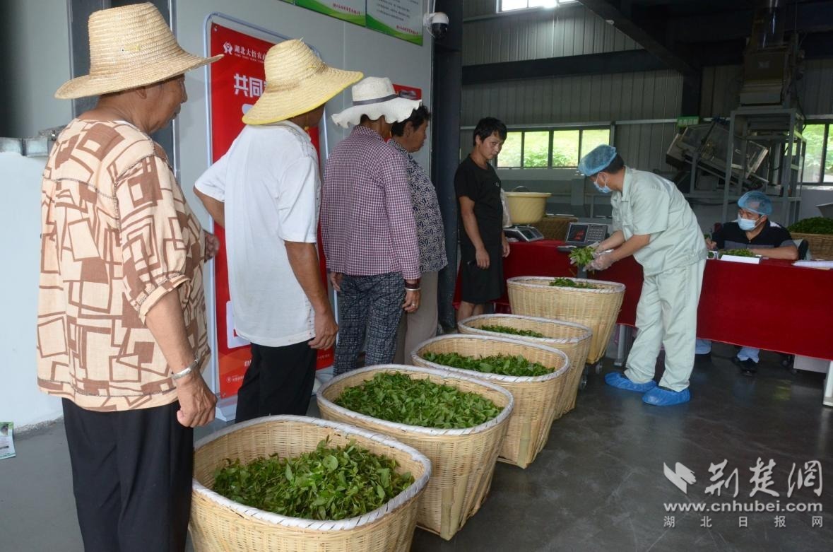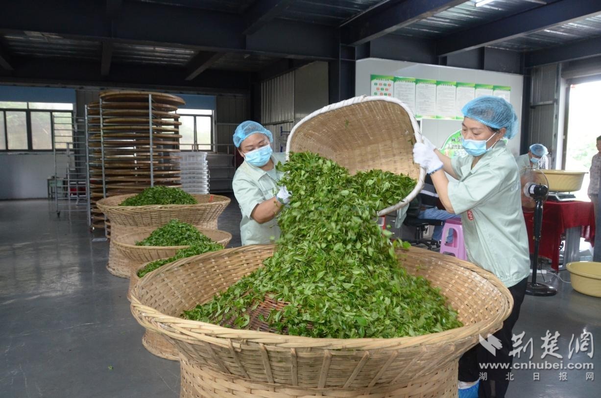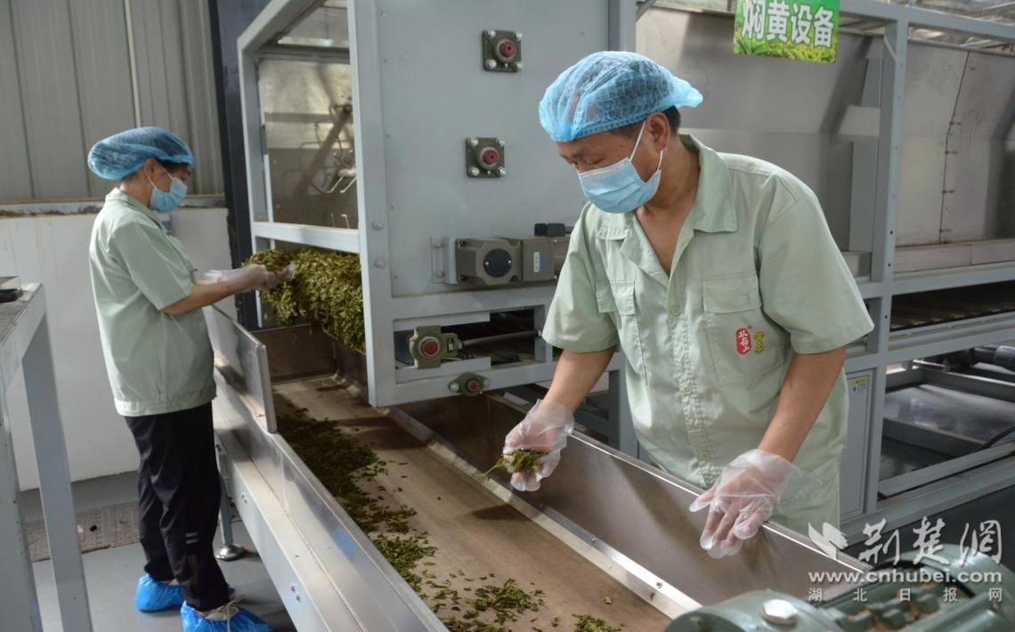 山上茶香四溢,山下?lián)尅磅r”加工。在朱灣村湖北紅綠黃茶業(yè)有限公司(以下簡(jiǎn)稱紅綠黃公司)的茶葉加工生產(chǎn)車間內(nèi),村民剛采摘的鮮葉都會(huì)被集中送到這里。經(jīng)過(guò)三燜三烘、發(fā)酵提香等工藝后,濃郁撲鼻、黃醇干爽的黃茶便新鮮出爐。