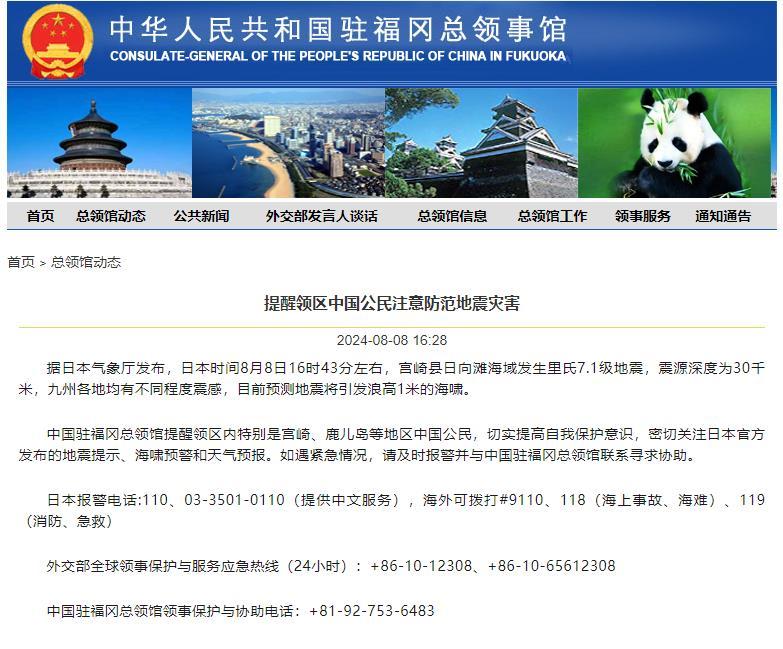 中國(guó)駐福岡總領(lǐng)館提醒領(lǐng)區(qū)內(nèi)特別是宮崎、鹿兒島等地區(qū)中國(guó)公民,切實(shí)提高自我保護(hù)意識(shí),密切關(guān)注日本官方發(fā)布的地震提示、海嘯預(yù)警和天氣預(yù)報(bào)。如遇緊急情況,請(qǐng)及時(shí)報(bào)警并與中國(guó)駐福岡總領(lǐng)館聯(lián)系尋求協(xié)助。