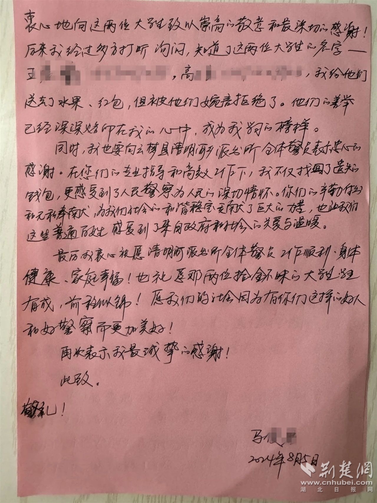 荊楚網(wǎng)(湖北日?qǐng)?bào)網(wǎng))訊( 通訊員 楊婷婷 宋珣)“在這封信里,我滿懷感激之情想要對(duì)貴所,及兩位不留姓名品德高尚的大學(xué)生表達(dá)我最深的謝意……”