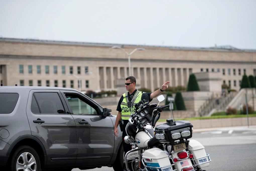 2021年8月3日,一名警察在美國弗吉尼亞州阿靈頓的五角大樓附近執(zhí)勤。新華社記者劉杰攝