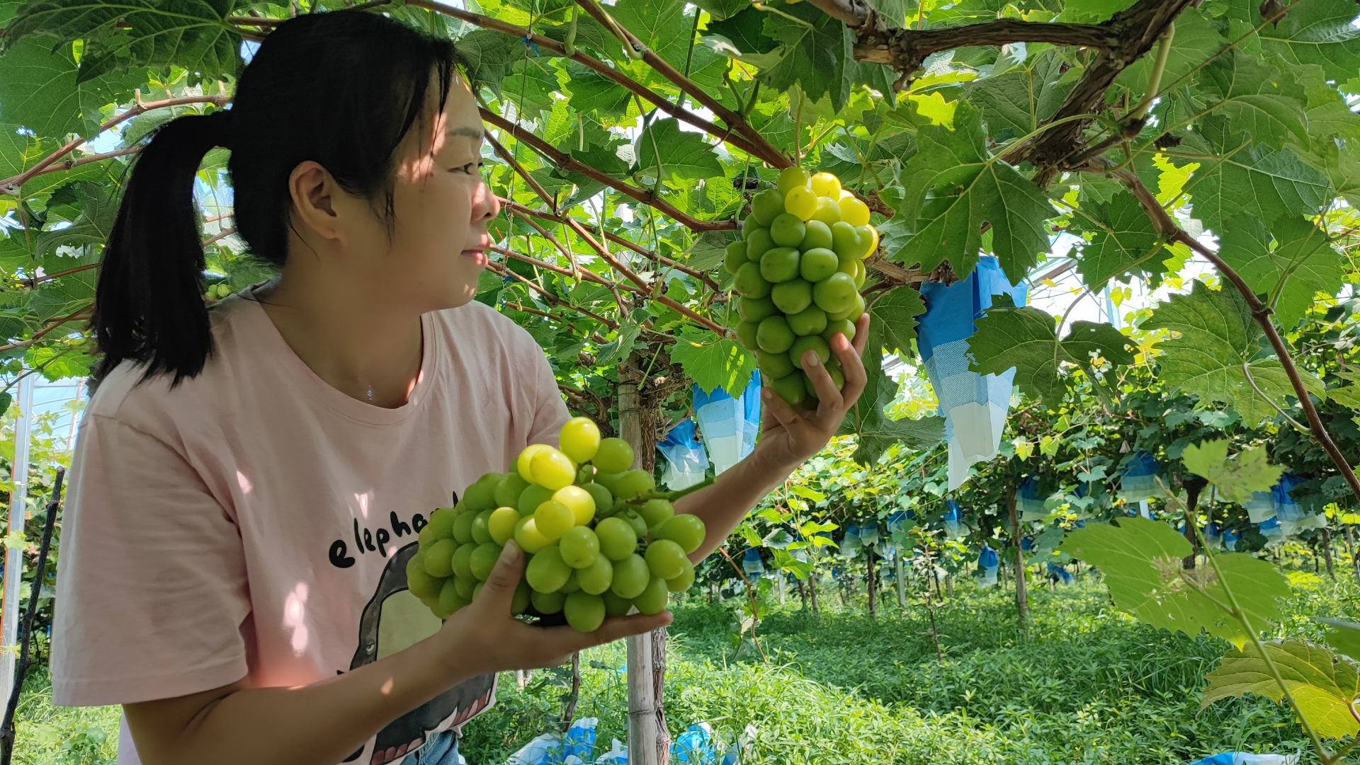 走進(jìn)葡萄園內(nèi),一串串套著紙袋的葡萄赫然映入眼前,輕輕取下紙袋,晶瑩剔透的葡萄翠綠中帶著金黃,在陽(yáng)光的照射下,宛如一顆顆璀璨的綠寶石,吸引眾多游客前來(lái)體驗(yàn)采摘樂(lè)趣。