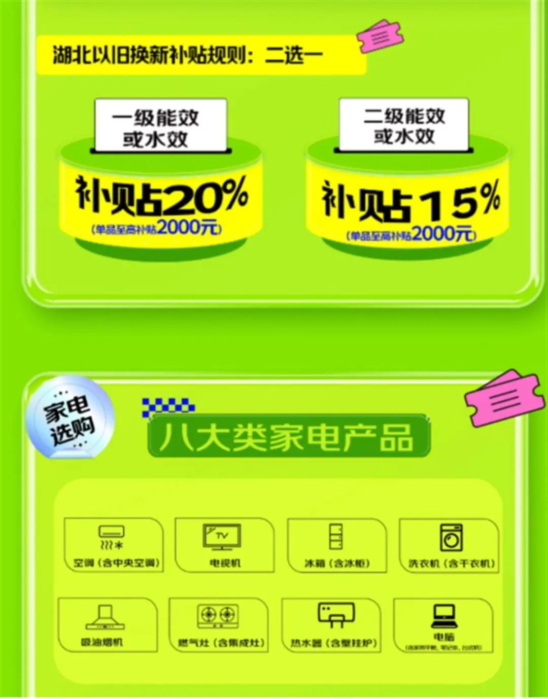 依據(jù)國家發(fā)展改革委、財(cái)政部7月25日發(fā)布的《關(guān)于加力支持大規(guī)模設(shè)備更新和消費(fèi)品以舊換新的若干措施》,湖北省商務(wù)廳自即日起至12月31日,開展家電以舊換新活動(dòng)。此次活動(dòng)覆蓋空調(diào)、冰箱、洗衣機(jī)、電視機(jī)、吸油煙機(jī)、燃?xì)庠?、熱水器、電腦等八大類產(chǎn)品,一級(jí)能效/水效家電享受20%的補(bǔ)貼,二級(jí)能效/水效家電享受15%的補(bǔ)貼。