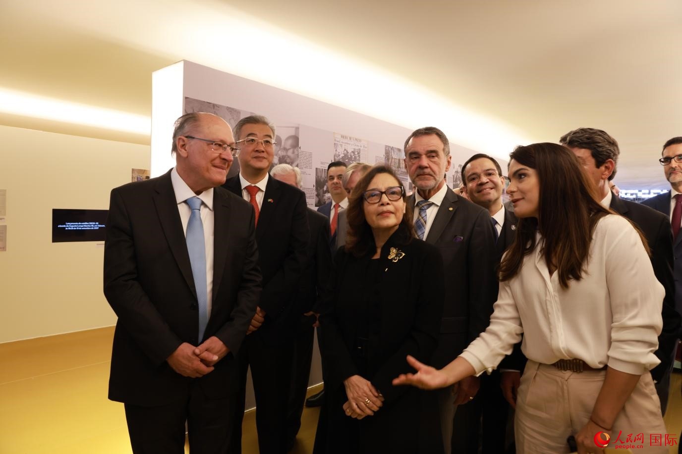 巴西副總統(tǒng)阿爾克明、巴西代外長達(dá)羅莎,以及中國駐巴西大使祝青橋等在巴西外交部參觀“巴西—中國:五十年友誼與合作 邁向包容與可持續(xù)發(fā)展”展覽。人民網(wǎng)記者 宋亦然攝
