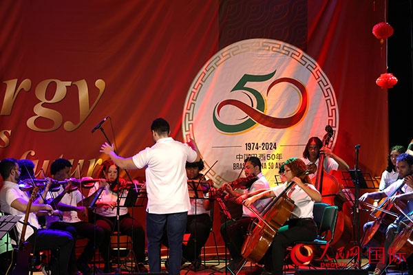 人民網(wǎng)里約熱內(nèi)盧8月16日電 (記者時元皓)為慶祝中國和巴西建交50周年,當(dāng)?shù)貢r間16日晚,中國國家電網(wǎng)巴西控股公司(簡稱“國網(wǎng)巴控公司”)在里約熱內(nèi)盧舉行“能源引領(lǐng)未來”主題文藝演出活動,馬累明日之潮交響樂團(tuán)等藝術(shù)團(tuán)體、藝術(shù)家?guī)砭矢栉璞硌?,中巴各界人士百余人觀看演出。