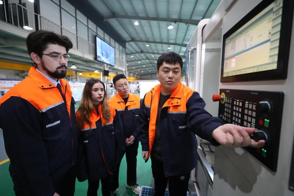 2023年12月6日,沈工-華中數(shù)控“一帶一路”訂單班同學(xué)為俄羅斯伊爾庫茨克國立大學(xué)的留學(xué)生講解數(shù)控五軸加工中心操作經(jīng)驗(yàn)。新華社記者楊青攝