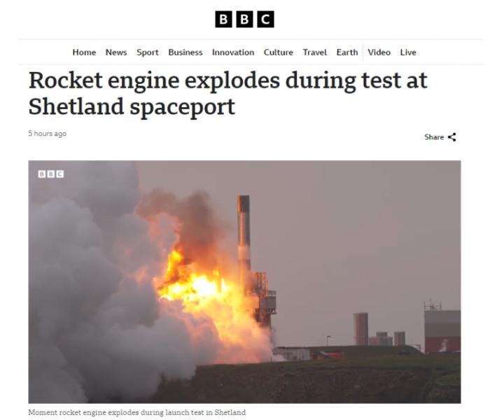 中新網8月20日電 綜合英媒報道,當地時間8月19日,英國設得蘭群島一新建太空港進行火箭發(fā)射測試時,火箭發(fā)動機發(fā)生爆炸,現場被巨大火焰吞沒。