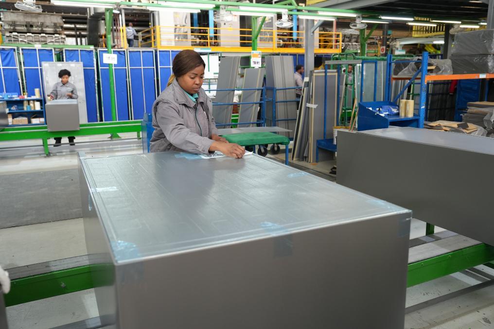 8月14日,在南非開普敦,當(dāng)?shù)貑T工在海信南非工業(yè)園的冰箱生產(chǎn)線上工作。新華社記者王雷攝