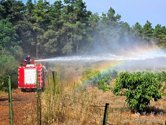 由于通行的路較窄,消防救援人員只能使用小型水罐消防車往返運(yùn)輸,保障30余畝果苗的澆灌用水。在鋪設(shè)水帶、連好水槍后,消防員們站在消防車車頂開始給柑橘苗種植區(qū)域進(jìn)行澆灌,只見一條“水龍”從水炮口噴射而出,在田間下了一場(chǎng)“及時(shí)雨”。