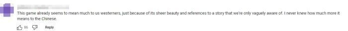 還有人感嘆,“僅憑借純粹的美感和一些我們不太了解的故事背景,這款游戲就已經(jīng)讓我們西方人覺(jué)得很有意義了。我之前并不知道,它對(duì)中國(guó)人意味著更多?!?/p>