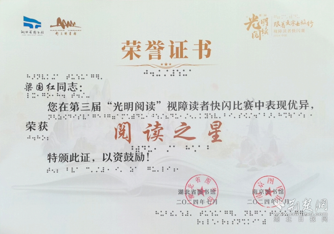 荊楚網(湖北日報網)訊(通訊員 吳凌)近日,第三屆全國”光明閱讀"快閃賽組委會公布獲獎名單,孝南區(qū)殘聯(lián)榮獲“優(yōu)秀組織獎”榮譽稱號,孝南區(qū)視障讀者代表梁國紅被評為省級”閱讀之星”,8月22日下午,孝南區(qū)殘聯(lián)為梁國紅及時送了喜報。