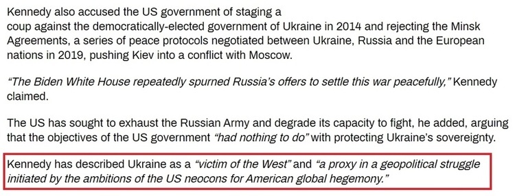 同時,小肯尼迪還指責(zé)美國政府在2014年對烏克蘭發(fā)動顏色革命,并拒絕接受烏克蘭、俄羅斯以及其他歐洲國家在2019年談判達(dá)成的《明斯克協(xié)議》,將基輔人為推向了與莫斯科的沖突。