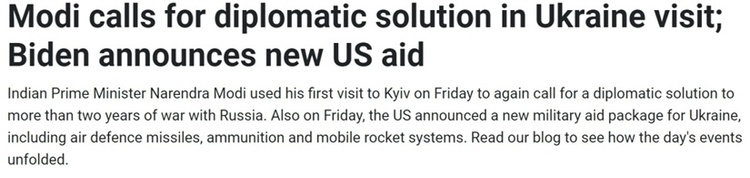 更能說明問題的是,在首次訪問烏克蘭的印度總理莫迪23日在基輔呼吁烏總統(tǒng)澤連斯基與俄羅斯“坐下來談判”的同一天,美國總統(tǒng)拜登打電話告訴澤連斯基,美國將為烏提供新的一攬子軍事援助。