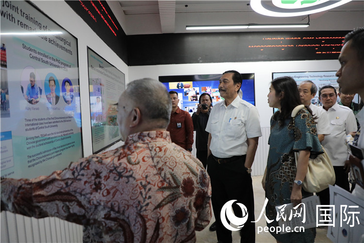 印尼對華合作牽頭人、統(tǒng)籌部長盧胡特(中)參觀中國—印尼新能源材料與冶金工程技術(shù)聯(lián)合研究實驗室。人民網(wǎng)記者 曹師韻攝