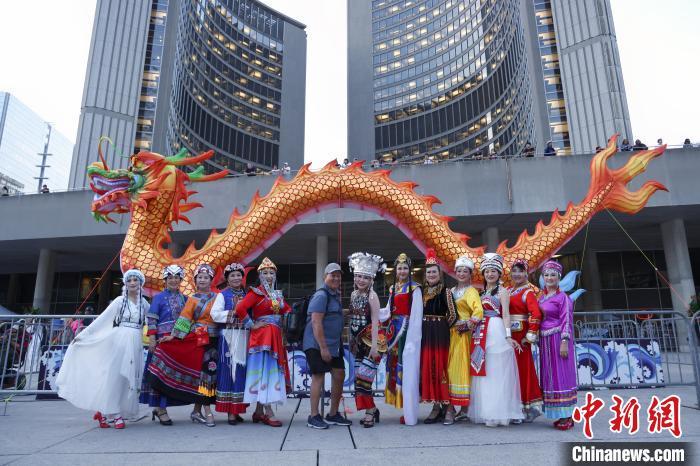 當(dāng)?shù)貢r(shí)間8月30日,加拿大多倫多,當(dāng)?shù)孛癖娕c參加第五屆多倫多龍文化節(jié)開幕日演出的、身著中國多個(gè)民族服飾的華人社區(qū)演員在市政廳前的巨龍彩燈下合影。中新社記者 余瑞冬 攝