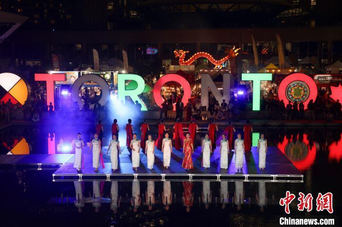 當(dāng)?shù)貢r(shí)間8月30日,加拿大多倫多,華人文藝團(tuán)體演員在當(dāng)日揭幕的第五屆多倫多龍文化節(jié)水上秀臺進(jìn)行旗袍秀的夜場表演。中新社記者 余瑞冬 攝