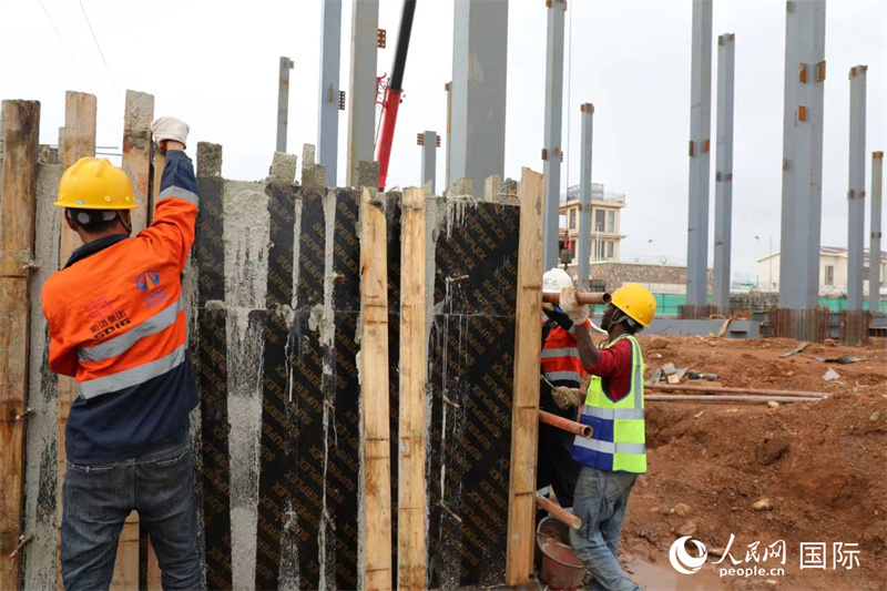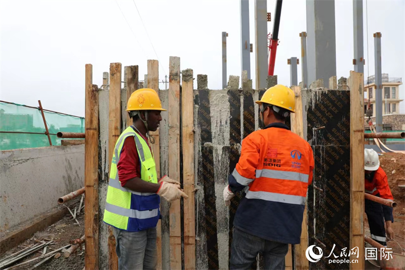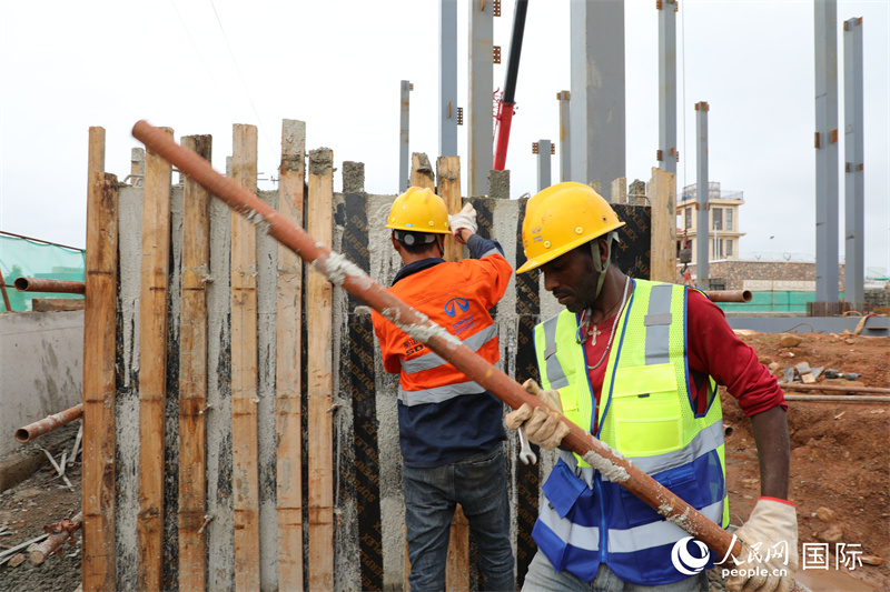 在厄立特里亞孔子學(xué)院教學(xué)樓項目現(xiàn)場,中厄員工正合力進行項目建設(shè)。人民網(wǎng)記者 沈小曉攝